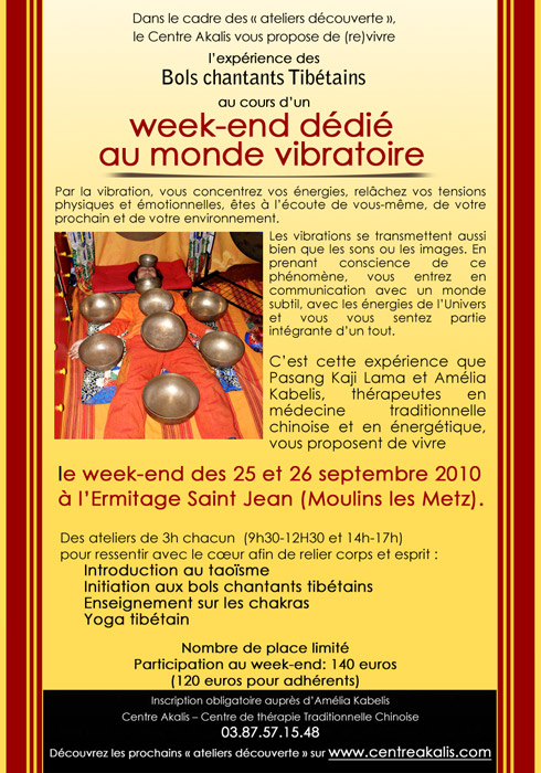 Atelier proposé par Amélia Kabelis Pasang Kaji Lama Tout un we avec des ateliers de 3h chacun pour ressentir avec le cœur afin de relier corps et esprit : Introduction au taoïsme et enseignement sur les chakras animés par Amélia Kabelis Initiation aux bols chantants tibétains et yoga tibétain animés par Pasang Kaji Lama