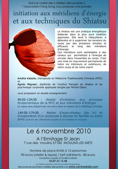 ![]() JOURNÉE D’INITIATION AUX MÉRIDIENS D’ÉNERGIE ET AUX TECHNIQUES DU SHIATSU cet atelier a eu lieu le Samedi 06 Novembre 2010 Double enseignement: 9h30-12h30 : Atelier d’initiation aux principes fondamentaux de la MTC et aux méridiens d’énergie 14h30-17h30 : Atelier d’auto-shiatsu (do in) et d’exploration d’un protocole à donner en famille ou entre amis (prévoir des vêtements souples et un matelas en mousse) Le repas sera pris en commun dans le respect de la diététique chinoise Ermitage St Jean 7, rue des Moulins 57160 Moulins-lès-Metz Témoignages